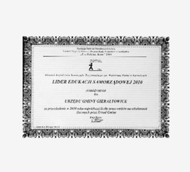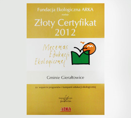 2012Fundacja Ekologiczna ARKA nadała Gminie Gierałtowice Złoty Certyfikat za wsparcie programów i kampanii edukacji ekologicznej.