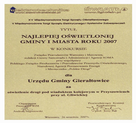 2007Gmina Gierałtowice otrzymała tytuł najlepiej oświetlonej gminy oraz nagrodę specjalną za oświetlenie boiska szkolnego w Przyszowicach.