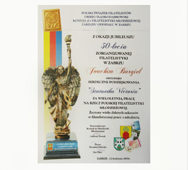2008Od Polskiego Związku Filatelistów dla wójta Joachima Bargiel za wieloletnią pracę na rzecz polskiej filatelistyki młodzieżowej.