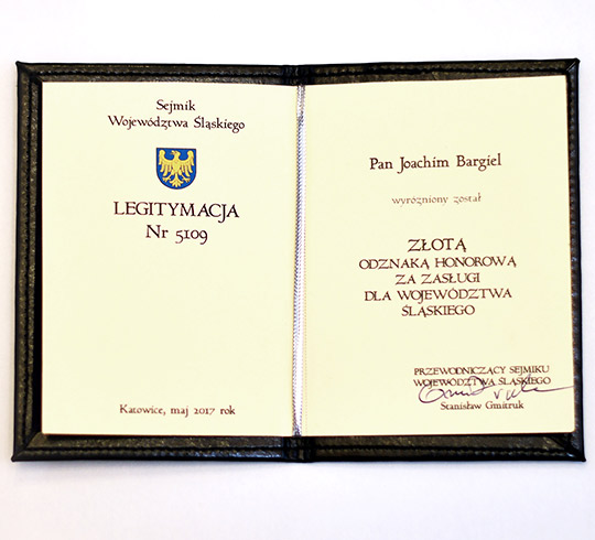 2017W 2017 roku Joachim Bargiel został odznaczony złotą odznaką honorową za zasługi dla województwa śląskiego