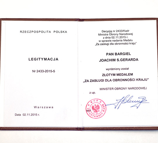 2015Joachim Bargiel został uhonorowany złotym medalem za zasługi dla Obronności Kraju w 2015 roku
